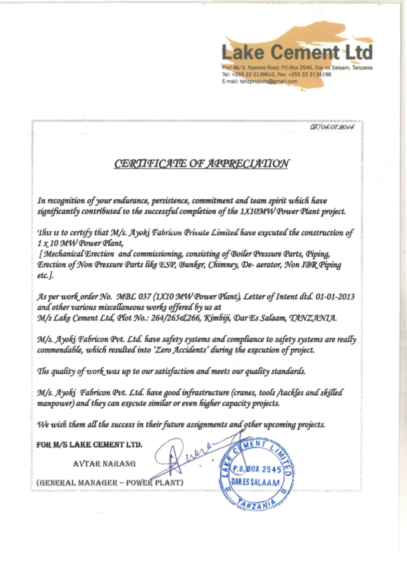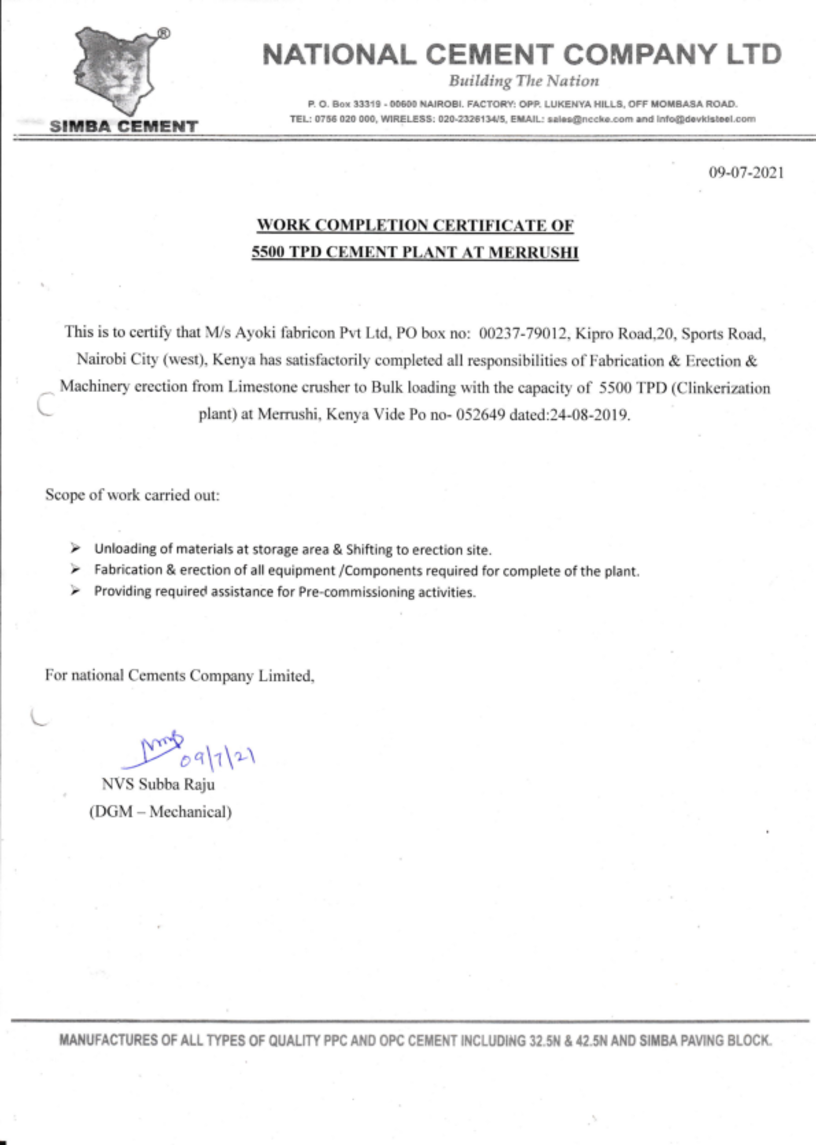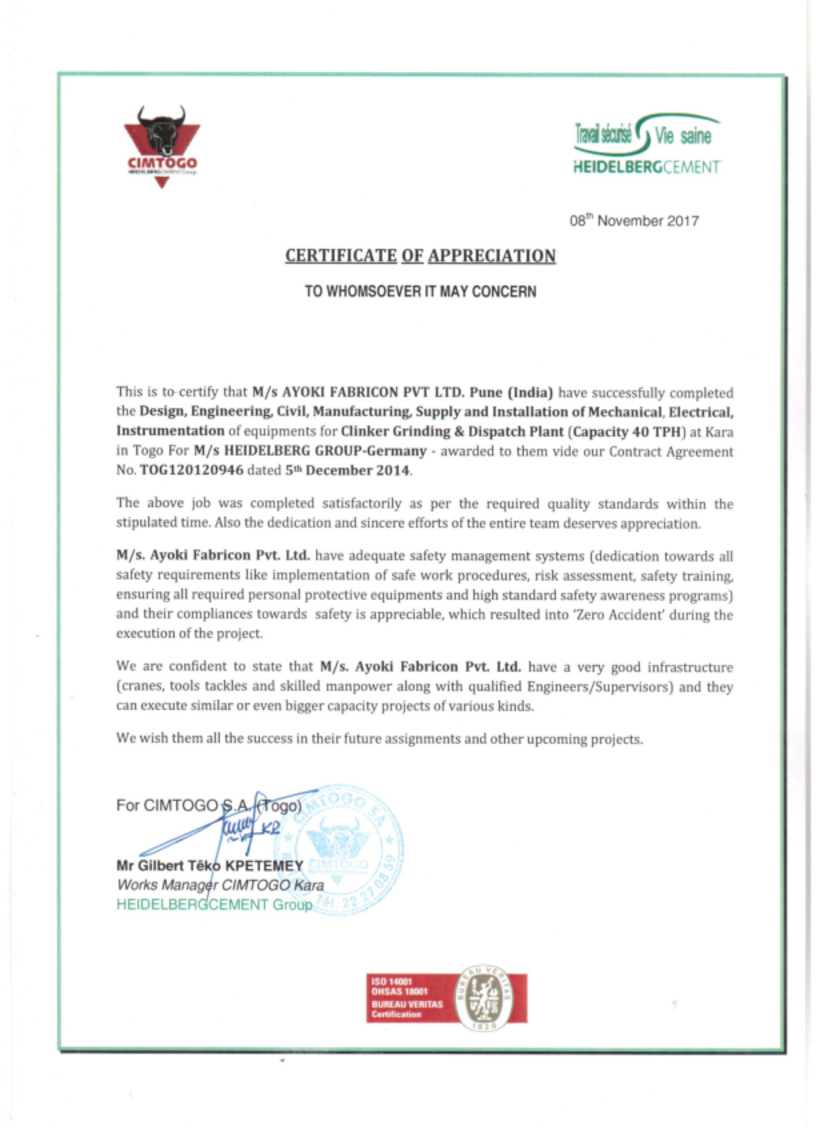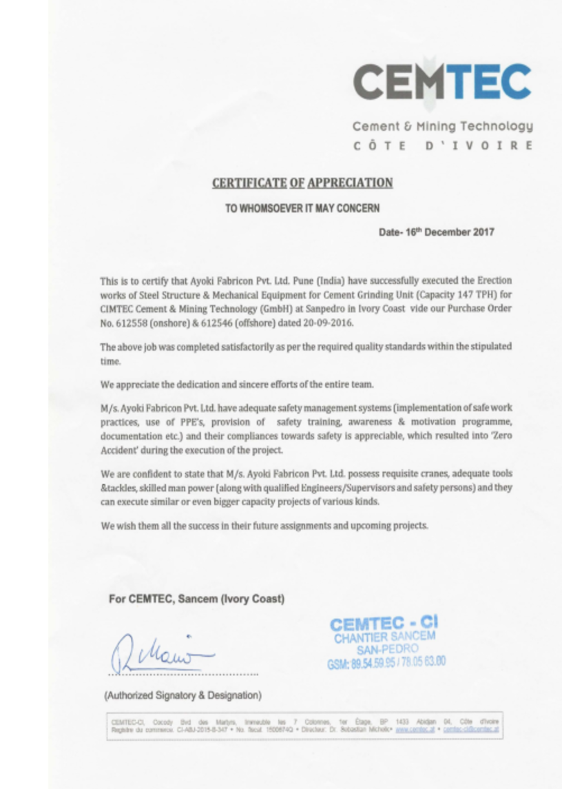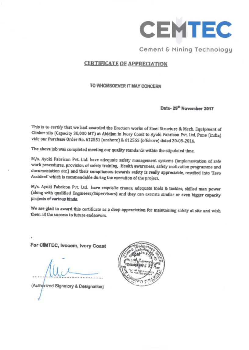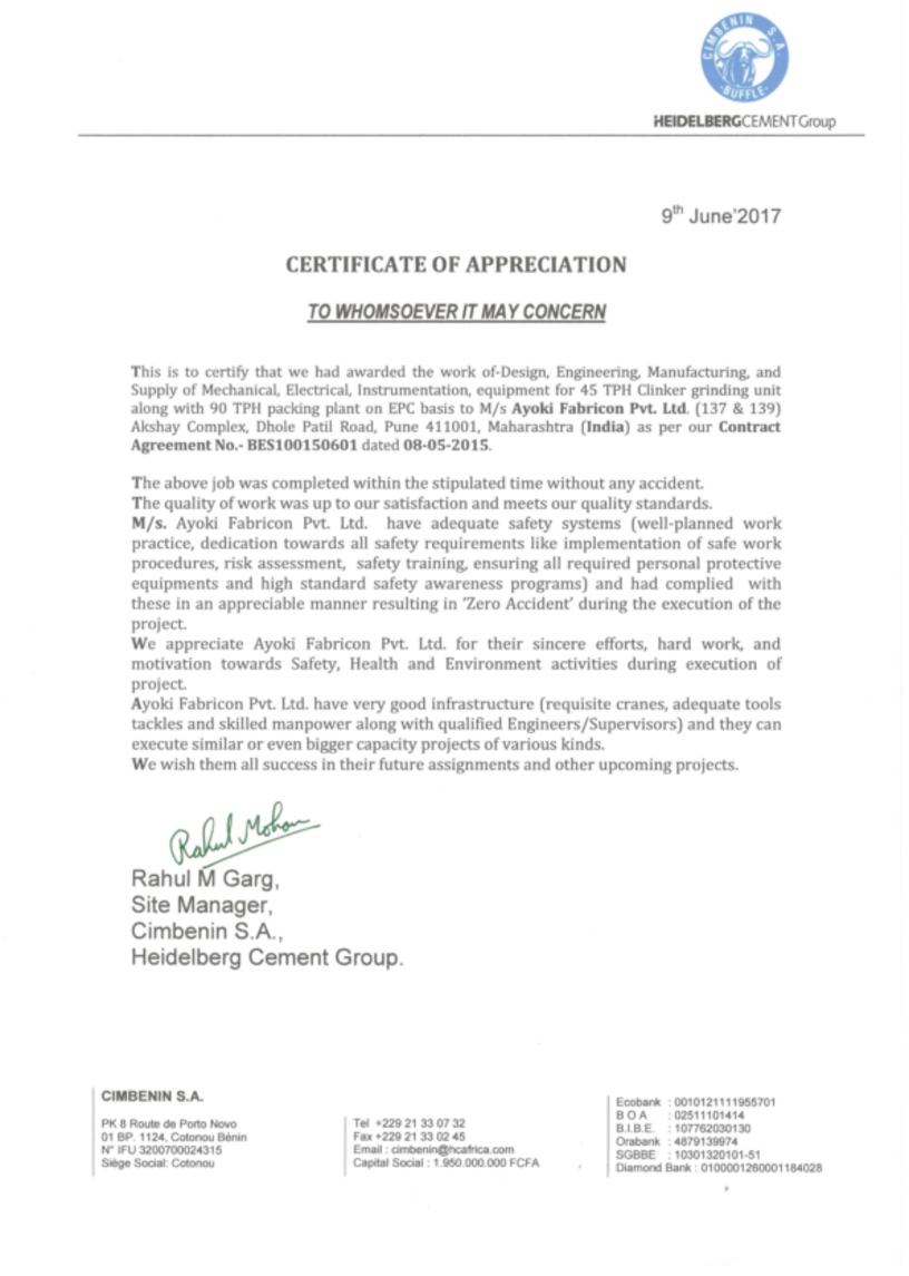 Bagged 18 Mn Euro contact from Dangote Group for construction of 3000 TPD Cement Project at Benue Cement, Nigeria.
