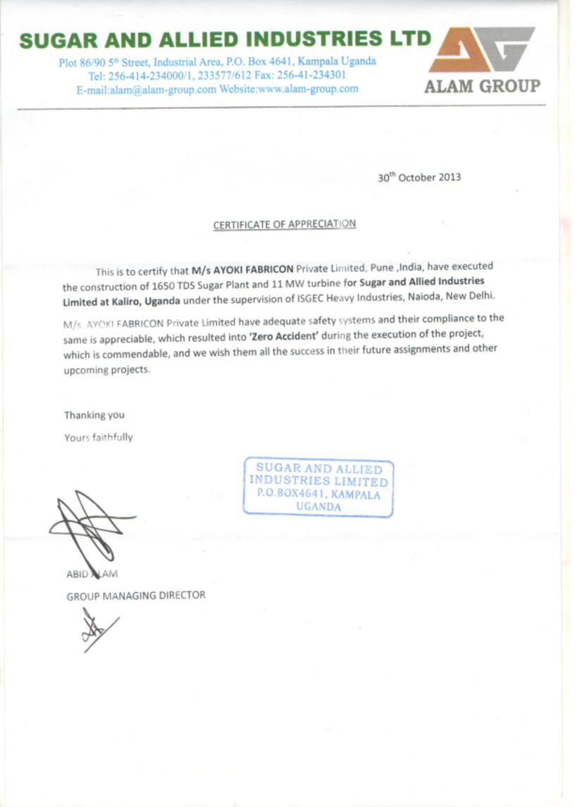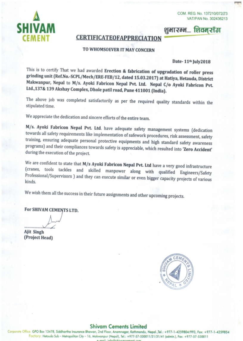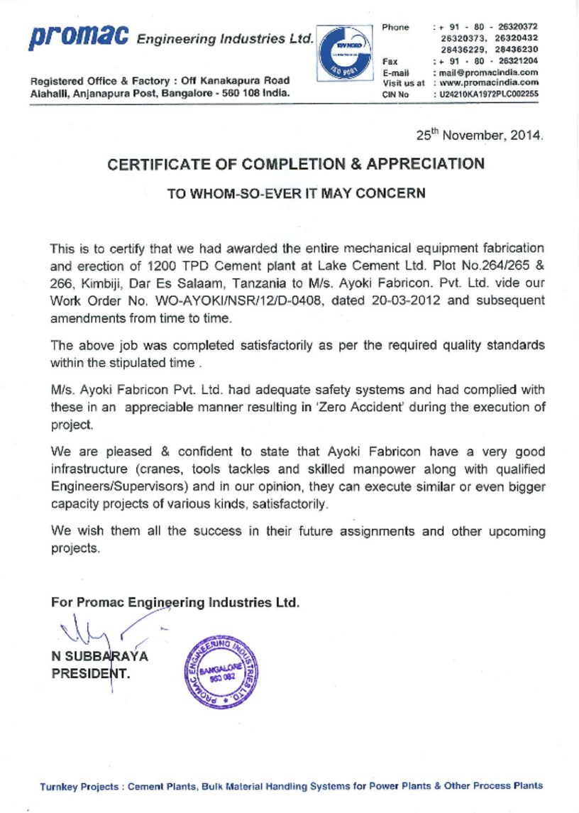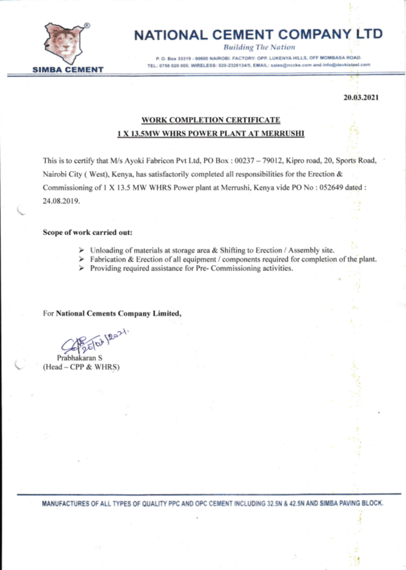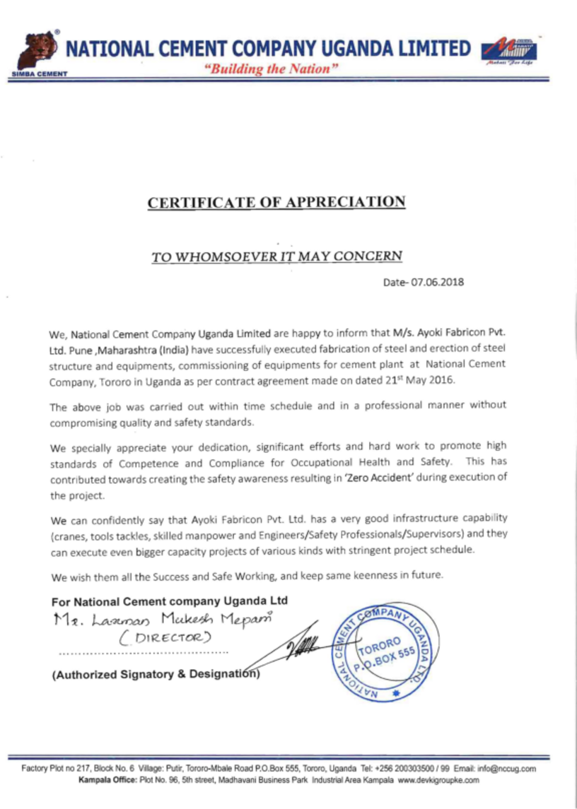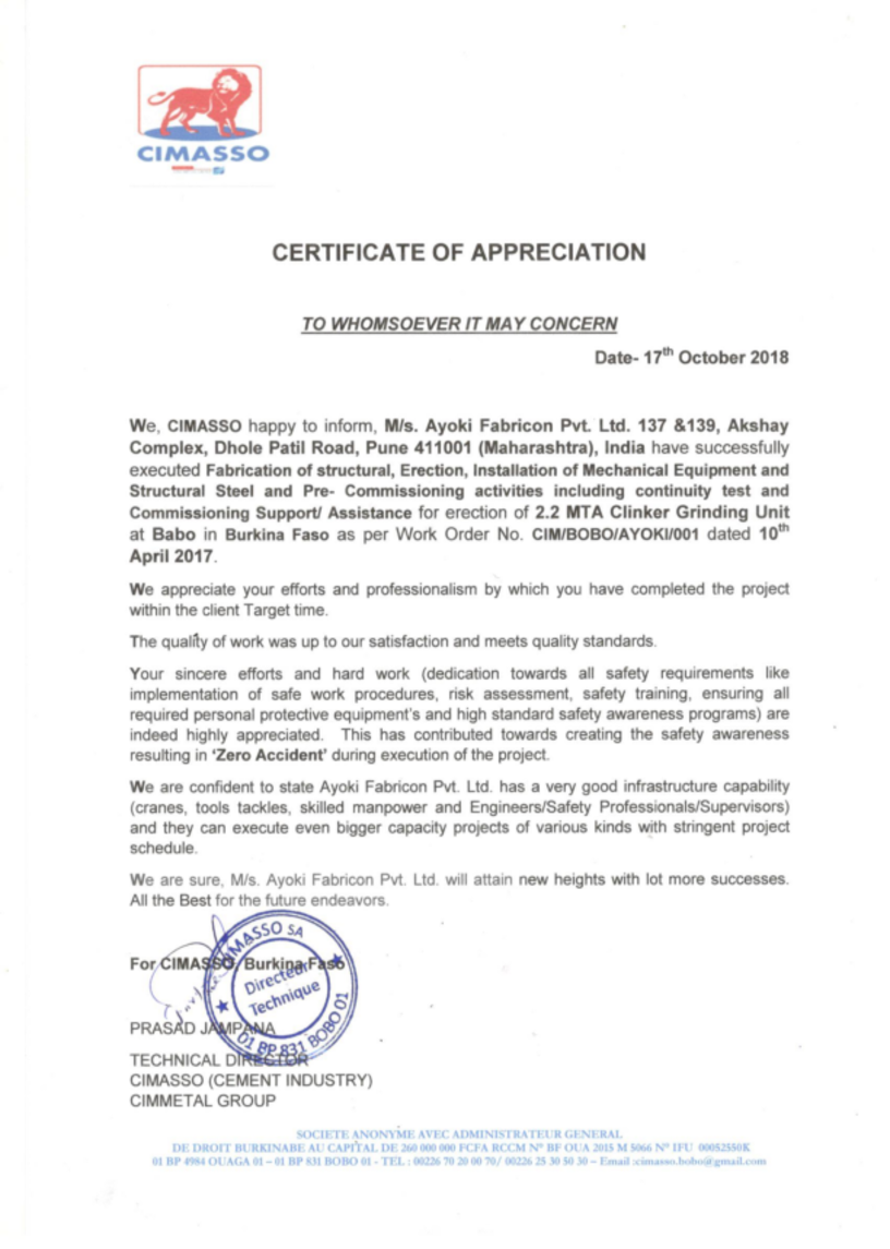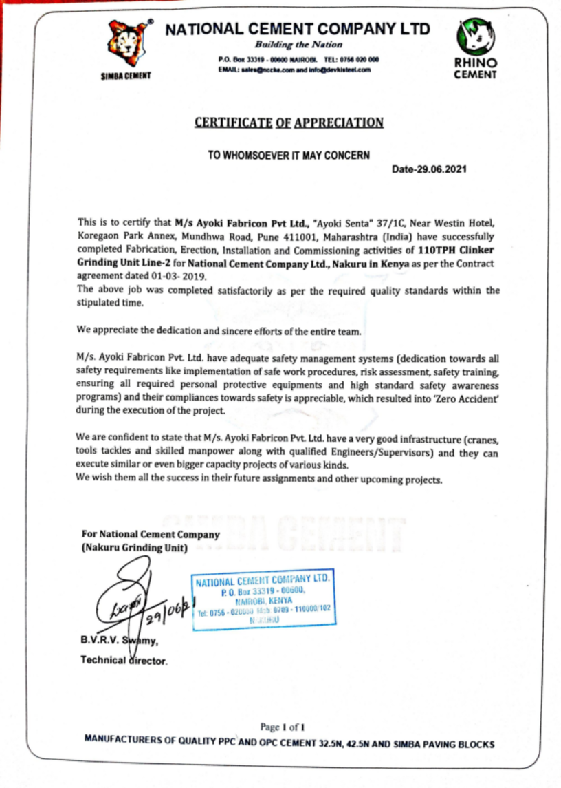 Bagged 18 Mn Euro contact from Dangote Group for construction of 3000 TPD Cement Project at Benue Cement, Nigeria.